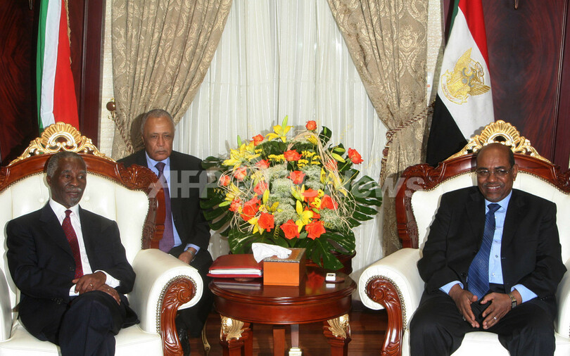 写真は10日、ハルツームで会談するバシル大統領(右)と、南アフリカのターボ・ムベキ(Thabo Mbeki)大統領。(c)AFP/ISAM AL-HAJ