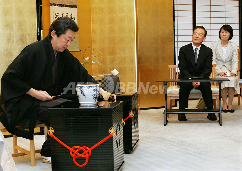 写真は13日、京都迎賓館で裏千家のお茶のもてなしを受ける温家宝首相(右から2人目)。(c)AFP/Itsuo Inouye
