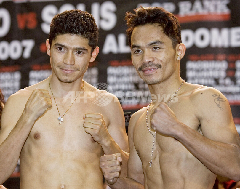 スポーツ スポーツ その他 <ボクシング>WBC世界スーパーフェザー級タイトルマッチを控え前日計量が行われる - 米国 2007年4月14日 7:22 発信地:米国 [ 北米 米国 ] このニュースをシェア ‹ › ❮ 3/3 ❯ <ボクシング>WBC世界スーパーフェザー級タイトルマッチを控え前日計量が行われる - 米国 画像作成中 ! 【サンアントニオ/米国 13日 AFP】ボクシング、WBC世界スーパーフェザー級タイトルマッチを翌14日に控え、王者マニー・パッキャオ(Manny Pacquiao、フィリピン)は、挑戦者ホルへ・ソリス(Jorge Solis、メキシコ)と共に前日計量を行った。写真はポーズを取るパッキャオとソリス(左)。(c)AFP/Paul J. Richards スポーツ その他 一覧へ> メディア・報道関係・法人の方向け 写真・動画 購入のお問合せ>