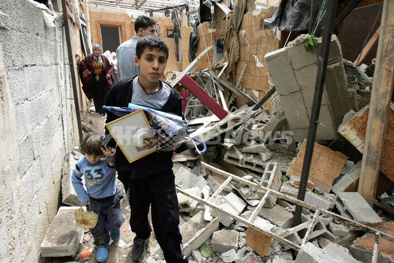 写真はヨルダン川西岸(West Bank)の都市Qalqiliyaで14日、イスラエル軍によって破壊された家屋のがれきの中から物を運び出す人々。(c)AFP/JAAFAR ASHTIYEH