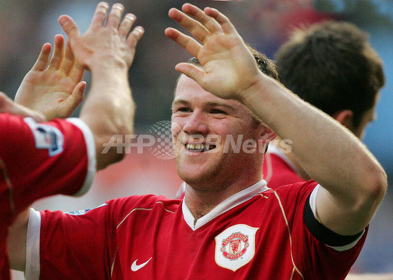 写真は、自身2点目のゴールを決めてチームメイトとハイタッチを交わすルーニー。(c)AFP/Geoff Caddick