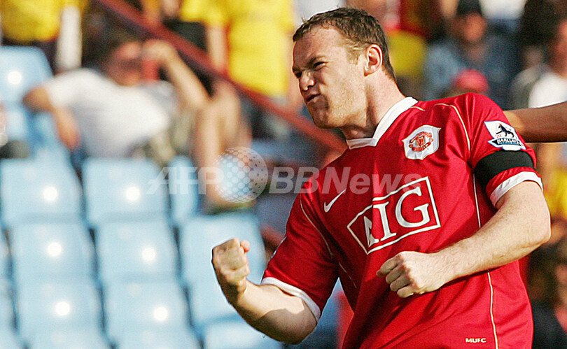 写真は、自身2点目のゴールを決めてチームメイトとハイタッチを交わすルーニー。(c)AFP/Geoff Caddick