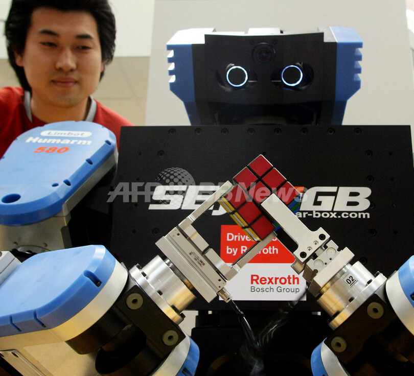 【ハノーバー/ドイツ 14日 AFP】ハノーバー(Hanover)で15日、「ハノーバー・メッセ2007」が開幕する。同博覧会には、世界68か国から産業テクノロジー分野の参加者たちが集まる。開会当日にはアンゲラ・メルケル(Angela Merkel)首相やトルコのレジェプ・タイップ・エルドアン(Recep Tayyip Erdogan)首相も出席予定。写真は14日、ルービックキューブに挑むロボット。(c)AFP/DDP/DAVID HECKER