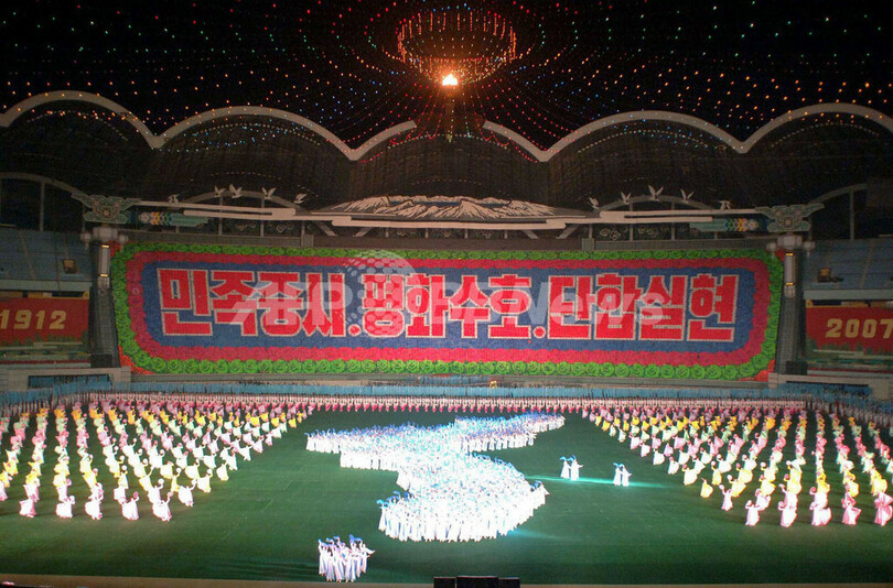 2006年10月、北朝鮮は初の核実験を実施。同国はその「核という筋肉」を収縮させ、米国から譲歩を引き出した。同実験では科学者らの決意が示されたが、「アリラン祭」においては、国民の国家に対する忠誠心が示されている。