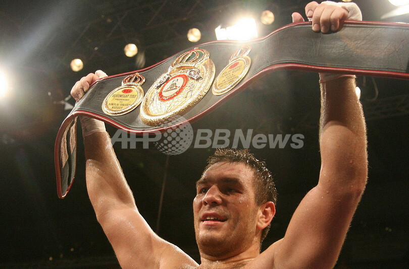 【シュツットガルト/ドイツ 14日 AFP】ボクシング、WBA世界ヘビー級タイトルマッチ12回戦。同級1位のルスラン・チャガエフ(Ruslan Chagaev、ウズベキスタン)は、王者ニコライ・ワルーエフ(Nikolay Valuev、ロシア)と対戦。試合は12ラウンド判定の末、チャガエフが2-0(114-114、117-111、115-113)でワルーエフを降し、同級タイトルを奪取した。写真は、チャンピオンベルトを掲げポーズを取るチャガエフ。(c)AFP/OLIVER LANG