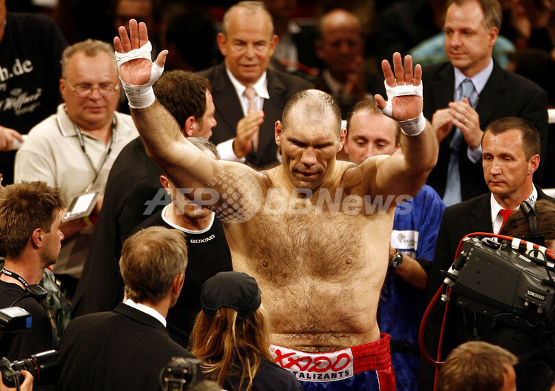 【シュツットガルト/ドイツ 14日 AFP】ボクシング、WBA世界ヘビー級タイトルマッチ12回戦。同級1位のルスラン・チャガエフ(Ruslan Chagaev、ウズベキスタン)は、王者ニコライ・ワルーエフ(Nikolay Valuev、ロシア)と対戦。試合は12ラウンド判定の末、チャガエフが2-0(114-114、117-111、115-113)でワルーエフを降し、同級タイトルを奪取した。写真は、チャンピオンベルトを掲げポーズを取るチャガエフ。(c)AFP/OLIVER LANG