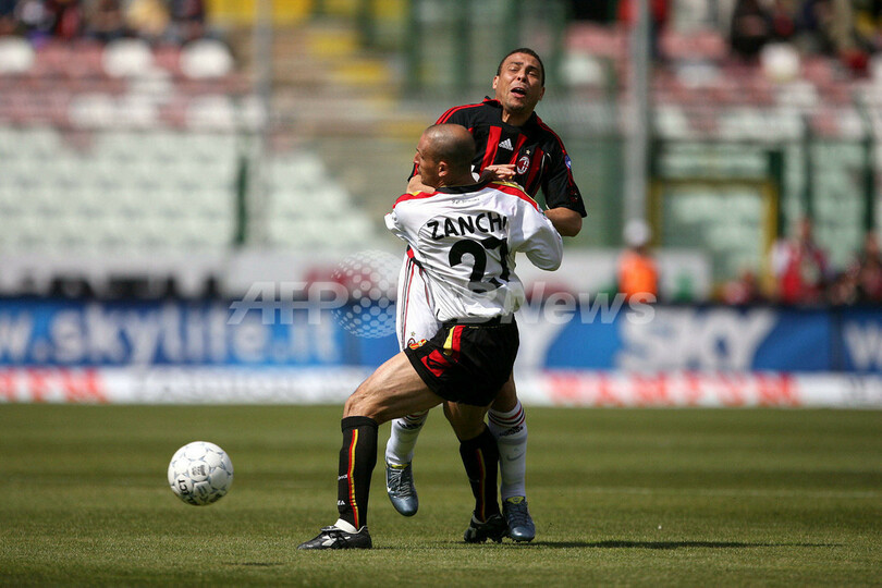 【メッシーナ/イタリア 15日 AFP】サッカー、イタリア・セリエA・第32節、メッシーナ(Messina)vsACミラン(AC Milan)。試合は後半40分にロナウド(Ronaldo)がチーム3点目のゴールを奪うなどミランが3-1で勝利し、勝ち点を50に伸ばして暫定ながらも来季欧州チャンピオンズリーグ(Champions League)出場権獲得圏内の4位に浮上した。写真は、ゴールの歓喜を表すロナウド。(c)AFP/Marcello PATERNOSTRO
