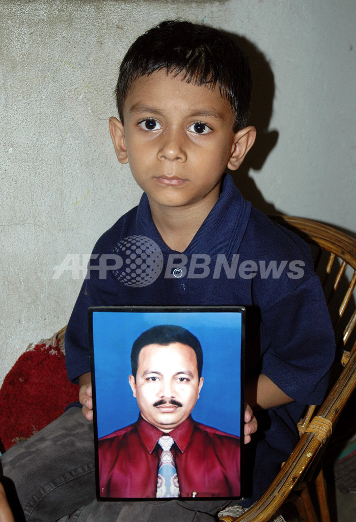 写真は、タリバンに誘拐されたインド人技術者の父親の写真を見せる息子(2006年4月29日撮影)。(c)AFP/NOAH SEELAM