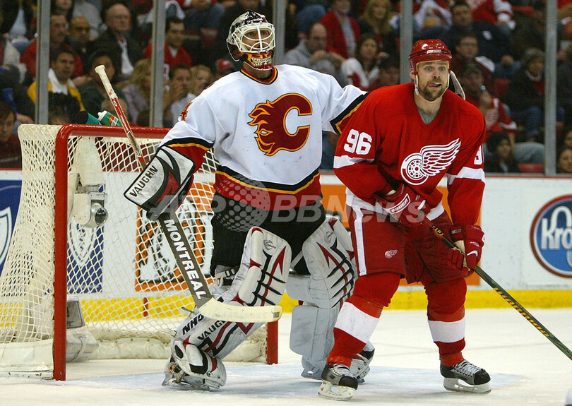 【デトロイト/米国 15日 AFP】06-07NHL、西カンファレンス・プレーオフ1回戦、デトロイト・レッドウィングス(Detroit Red Wings)vsカルガリー・フレームス(Calgary Flames)、第2戦。試合は3-1でレッドウィングスが勝利を収め、プレーオフ2連勝をマークした。写真はフレームスのDavid Mossと対峙するレッドウィングスのミカエル・サミュエルソン(Mikael Samuelsson、右)。(c)AFP/Getty Images Dave Sandford