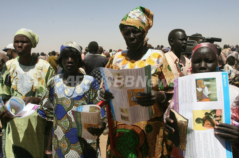 写真は3月18日、首都ハルツーム(Khartoum)南方45キロのJabal Awliaで国連児童基金(UNICEF)の宣伝冊子を受け取るスーダンの女性たち。(c)AFP/ISAM AL-HAJ