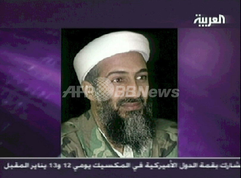 写真はドバイ(Dubai)の衛星放送局アル・アラビア(Al-Arabiya)が、オサマ・ビンラディンのものとされる音声テープを放送した際に流した、ビンラディンの映像。(2003年12月20日撮影)。(c)AFP/AL-ARABIYA