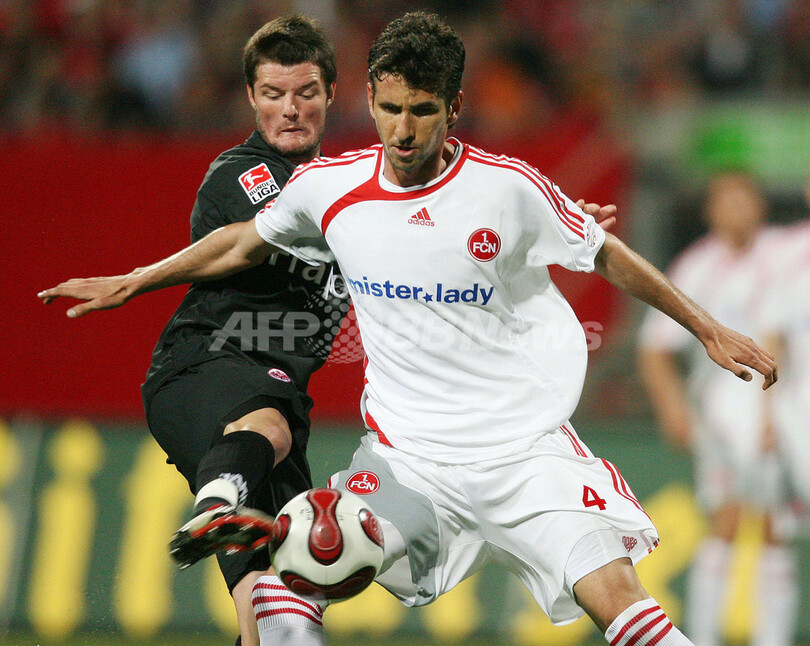 【ニュルンベルク/ドイツ 17日 AFP】サッカー、ドイツカップ(German Cup)・準決勝、ニュルンベルク(Nuremberg)vsフランクフルト(Eintracht Frankfurt)。試合は前半3分にマルコ・エンゲルハルト(Marco Engelhardt)のゴールで先制したニュルンベルクがその後も得点を重ねて4-0で快勝し、決勝進出を決めた。写真は、ヤン・クリスティアンセン(Jan Kristiansen、右)から祝福を受けるエンゲルハルト。(c)AFP/DDP/OLIVER LANG