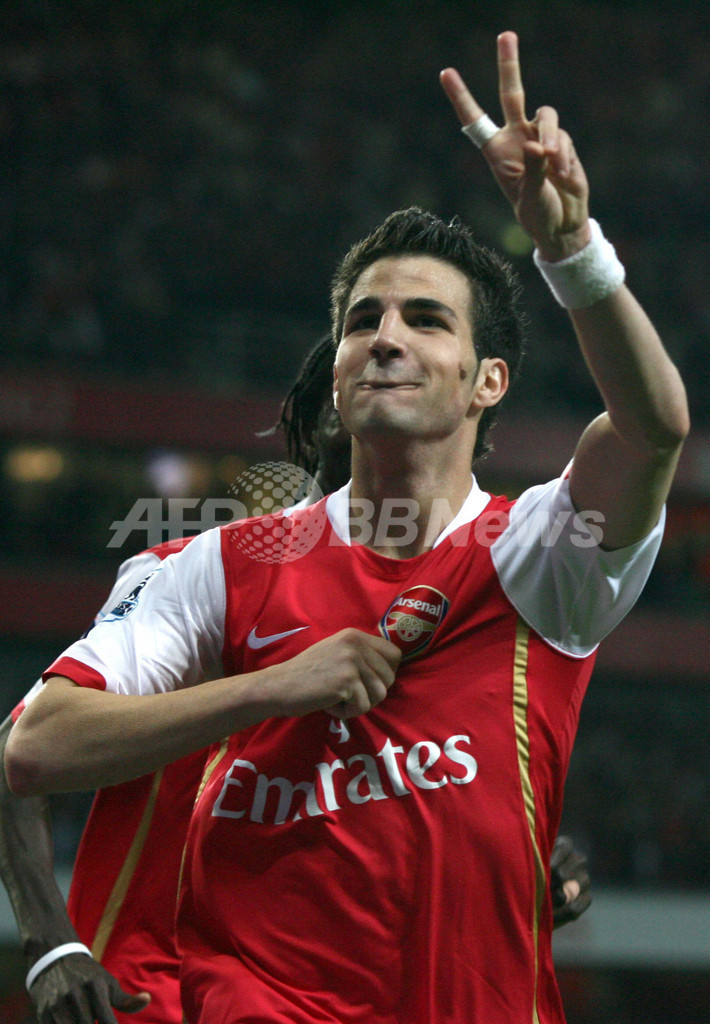 【ロンドン/英国 17日 AFP】サッカー、イングランド・プレミアリーグ・第25節順延分、アーセナル(Arsenal)vsマンチェスター・シティ(Manchester City)。アーセナルのセスク・ファブレガス(Cesc Fabregas)は、後半28分にチーム2点目のゴールを決めて2試合連続ゴールを記録した。試合はアーセナルが3-1で勝利を収め、シーズン18勝目を挙げて勝ち点を62に伸ばした。写真は、得点をサポーターにアピールするセスク。(c)AFP/CHRIS YOUNG