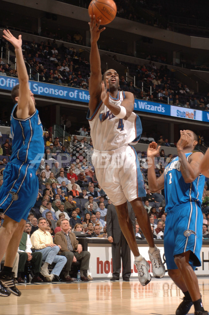 【ワシントンDC/米国 17日 AFP】06-07NBA、ワシントン・ウィザーズ(Washington Wizards)vsオーランド・マジック(Orlando Magic)。ウィザーズのアントワン・ジェイミソン(Antawn Jamison)は、48得点9リバウンドの活躍を見せるも、チームを勝利に導くことは出来なかった。試合は第4Qに逆転を許したウィザーズが95-89でマジックに敗れシーズン41敗目を喫した。写真は、シュートを放つジェイミソン。(c)AFP/Getty Images/NBAE Mitchell Layton