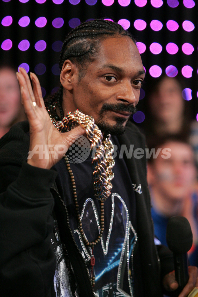 【ニューヨーク/米国 18日 AFP】銃器と薬物の不法所持で5年間の保護観察処分を受けた米国のラップスター、スヌープ・ドッグ(Snoop Dogg)が17日、MTVのタイムズ・スクエア・スタジオ(Times Square Studios)で行われたMTVの人気音楽情報番組「Total Request Live」に出演した。写真は、ステージ上でポーズをとるスヌープ・ドッグ。(c)AFP/Getty Images Bryan Bedder