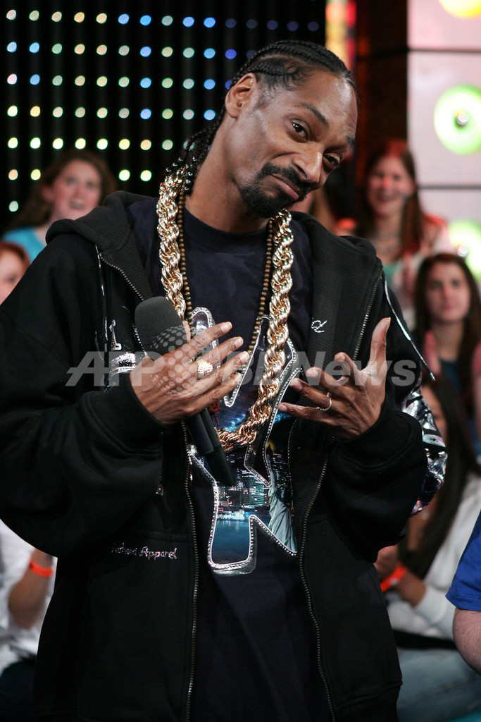 【ニューヨーク/米国 18日 AFP】銃器と薬物の不法所持で5年間の保護観察処分を受けた米国のラップスター、スヌープ・ドッグ(Snoop Dogg)が17日、MTVのタイムズ・スクエア・スタジオ(Times Square Studios)で行われたMTVの人気音楽情報番組「Total Request Live」に出演した。写真は、ステージ上でポーズをとるスヌープ・ドッグ。(c)AFP/Getty Images Bryan Bedder