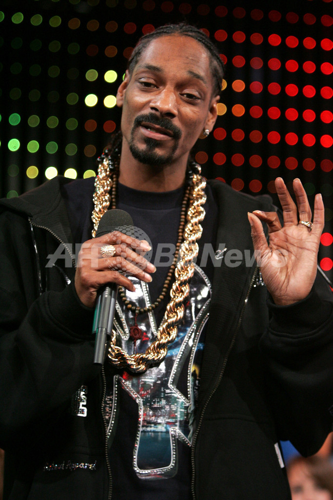 【ニューヨーク/米国 18日 AFP】銃器と薬物の不法所持で5年間の保護観察処分を受けた米国のラップスター、スヌープ・ドッグ(Snoop Dogg)が17日、MTVのタイムズ・スクエア・スタジオ(Times Square Studios)で行われたMTVの人気音楽情報番組「Total Request Live」に出演した。写真は、ステージ上でポーズをとるスヌープ・ドッグ。(c)AFP/Getty Images Bryan Bedder