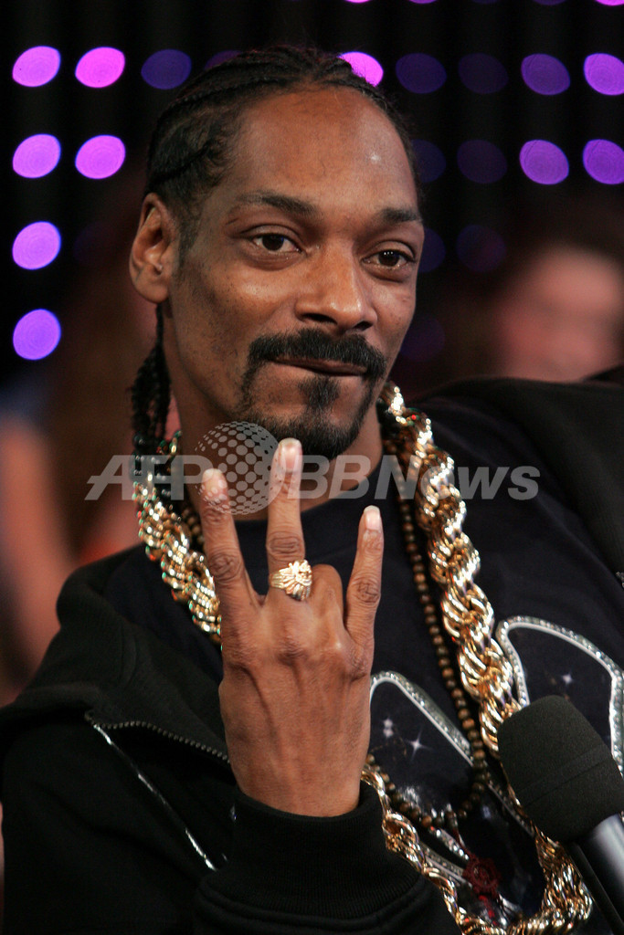 【ニューヨーク/米国 18日 AFP】銃器と薬物の不法所持で5年間の保護観察処分を受けた米国のラップスター、スヌープ・ドッグ(Snoop Dogg)が17日、MTVのタイムズ・スクエア・スタジオ(Times Square Studios)で行われたMTVの人気音楽情報番組「Total Request Live」に出演した。写真は、ステージ上でポーズをとるスヌープ・ドッグ。(c)AFP/Getty Images Bryan Bedder