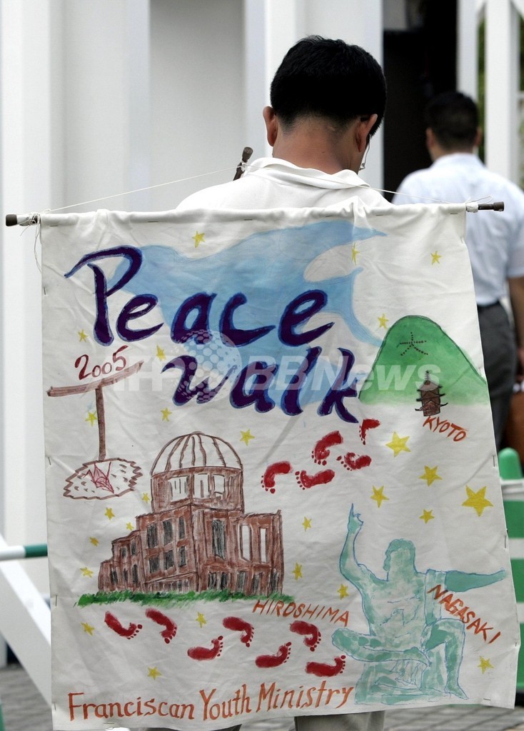 写真は長崎平和記念公園を歩く平和活動家(2005年8月8日撮影)。(c)AFP/TOSHIFUMI KITAMURA