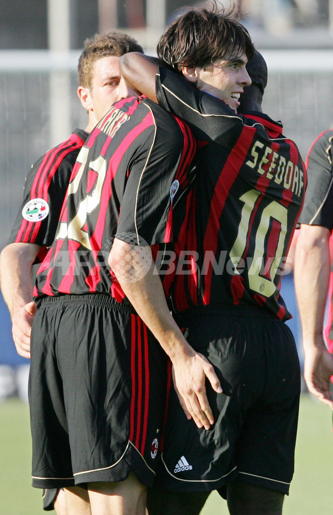 スポーツ サッカー <サッカー セリエA>ミラン 今季最多の5点を奪いアスコリに快勝 - イタリア 2007年4月19日 1:40 発信地:イタリア [ ヨーロッパ イタリア ] このニュースをシェア ‹ › ❮ 12/15 ❯ 写真は、クラレンス・セードルフ(%%Clarence Seedorf%%、右)から祝福を受けるカカ。(c)AFP/ANDREAS SOLARO 画像作成中 ! 【アスコリ/イタリア 18日 AFP】サッカー、イタリア・セリエA・第22節順延分、アスコリ(Ascoli)vsACミラン(AC Milan)。試合はカカ(Kaka)が2得点(前半25分、同35分)を挙げるなどミランが今季最多となる5点を奪い5-2で快勝し、3連勝で勝ち点を52に伸ばした。(c)AFP/ANDREAS SOLARO サッカー 一覧へ> メディア・報道関係・法人の方向け 写真・動画 購入のお問合せ>