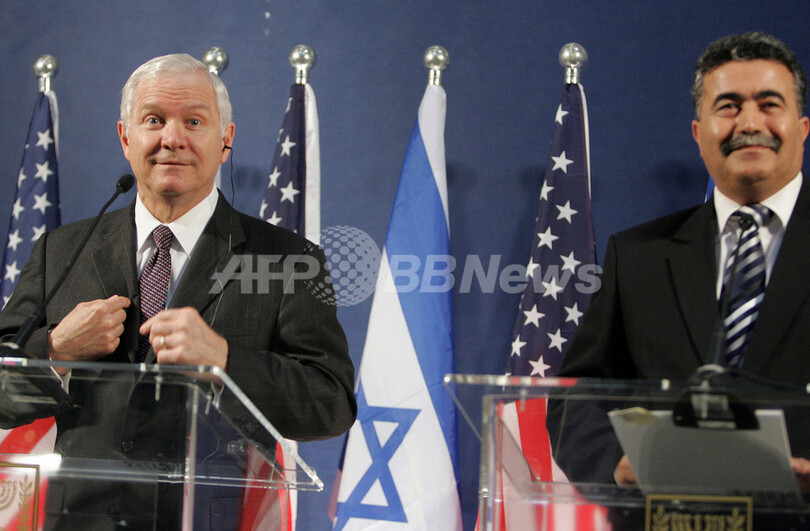 写真はイスラエルで18日、テルアビブ(Tel Aviv)にある国防省でアミール・ペレツ(Amir Peretz)イスラエル国防相と共同記者会見に臨むゲーツ米国防長官。(c)AFP/JACK GUEZ