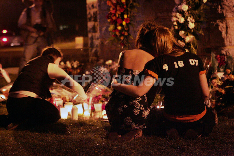 写真は19日、バージニア工科大学の慰霊碑に花を供える人々。(c)AFP/MANNIE GARCIA