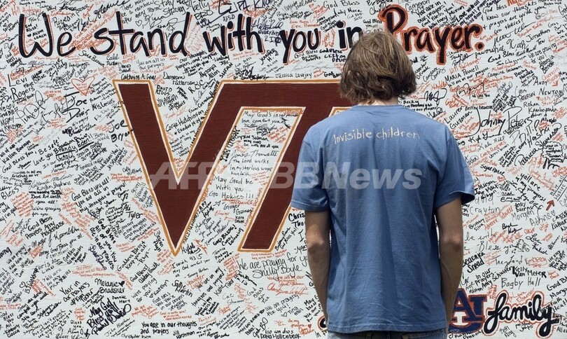 写真は19日、バージニア工科大学の慰霊碑に花を供える人々。(c)AFP/MANNIE GARCIA