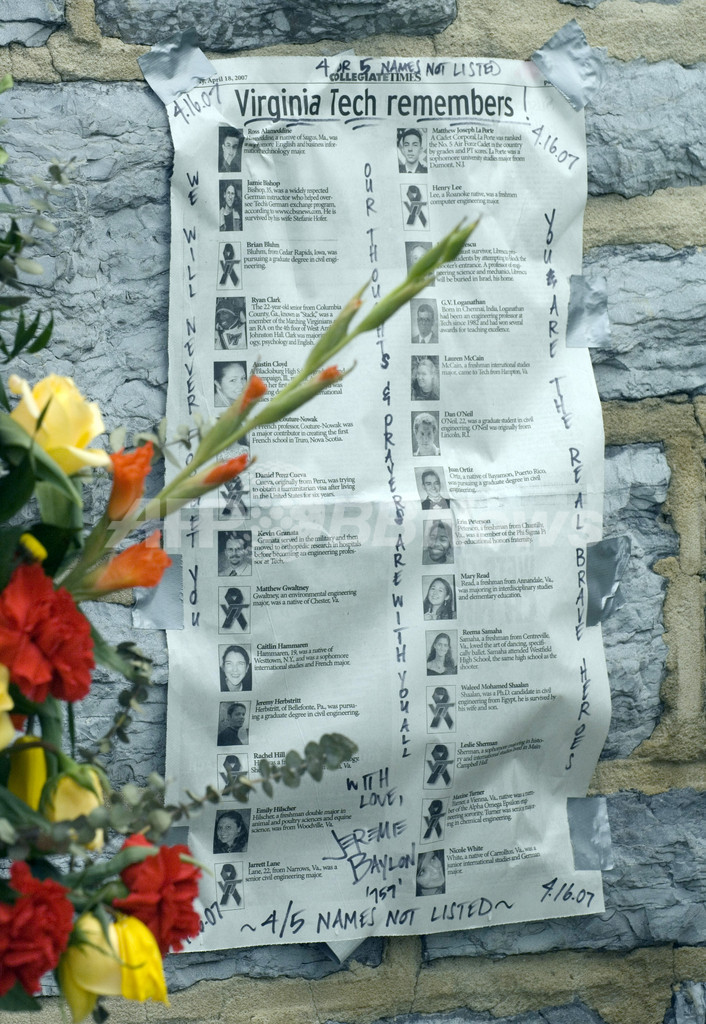 写真は19日、バージニア工科大学の慰霊碑に花を供える人々。(c)AFP/MANNIE GARCIA