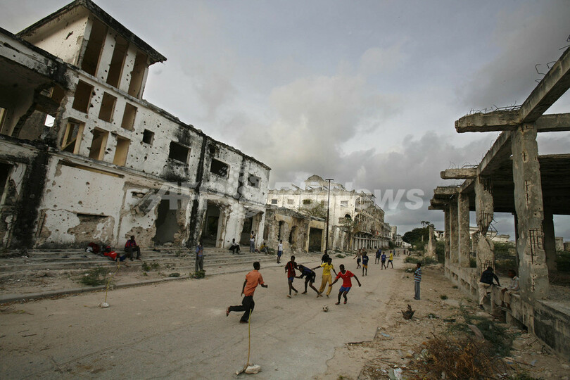 写真は、廃虚と化したモガディシオの路上でサッカーをする少年(2007年3月28日撮影)。(c)AFP/JOSE CENDON