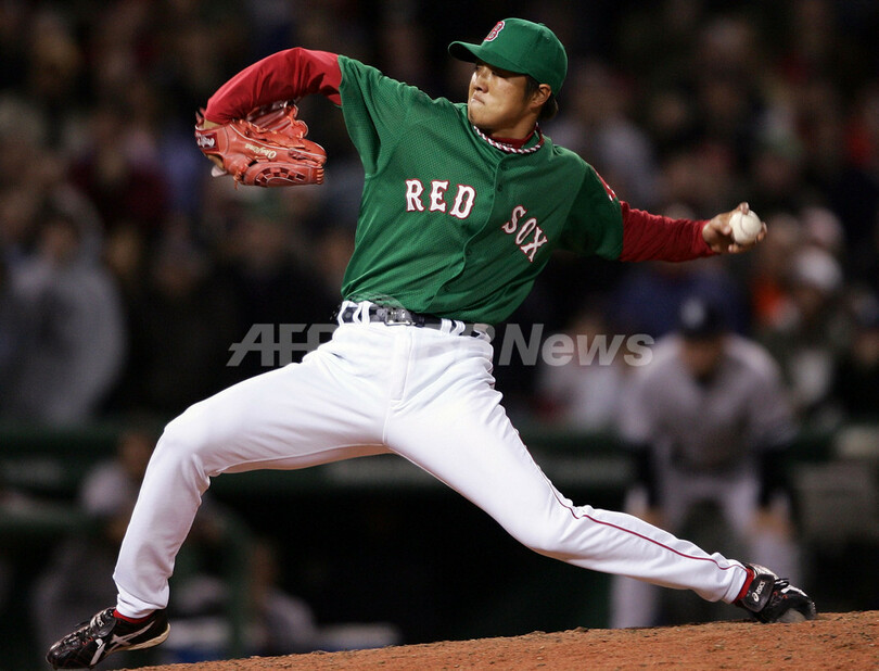 【ボストン/米国 20日 AFP】07MLB、ボストン・レッドソックス(Boston Red Sox)vsニューヨーク・ヤンキース(New York Yankees)。レッドソックスの岡島秀樹(Hideki Okajima)は、9回から4番手で登板し、四球を一つ与えるも後続を断ち、ヤンキース打線を無失点に抑えてメジャー初セーブを記録した。試合は7-6でレッドソックスが勝利を収めた。(c)AFP/Getty Images Elsa