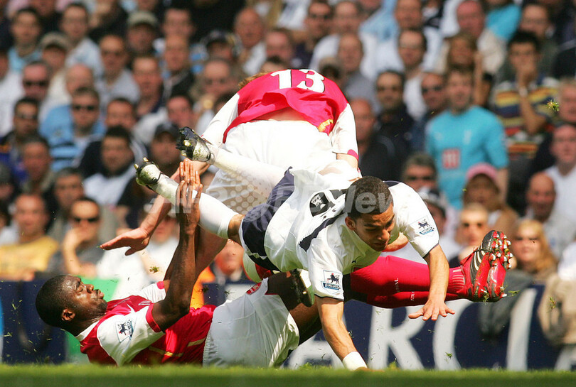 【ロンドン/英国 21日 AFP】サッカー、イングランド・プレミアリーグ・第35節、トッテナム・ホットスパー(Tottenham Hotspur)vsアーセナル(Arsenal)。共にロンドン北部に本拠地を構える両チームのノースロンドンダービーは2-2の引き分けに終わった。写真は、後半ロスタイムに同点ゴールを決められ落胆するアーセナルの(左から)セスク・ファブレガス(Cesc Fabregas)、ジルベルト・シウヴァ(Gilberto Silva)、ジュリオ・バプティスタ(Julio Baptista)。(c)AFP/CHRIS YOUNG