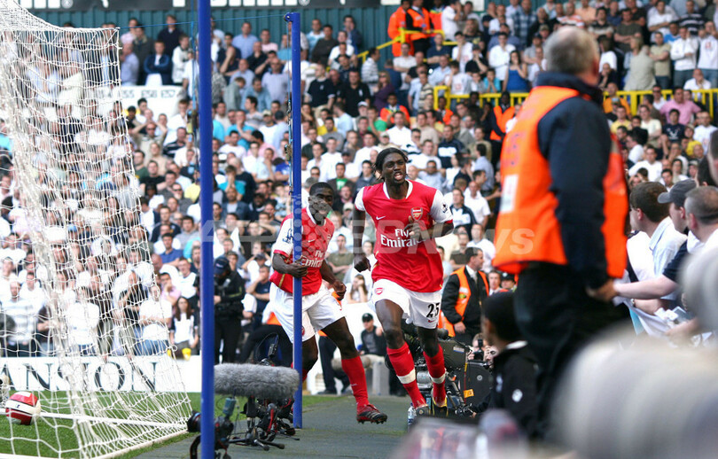 【ロンドン/英国 21日 AFP】サッカー、イングランド・プレミアリーグ・第35節、トッテナム・ホットスパー(Tottenham Hotspur)vsアーセナル(Arsenal)。共にロンドン北部に本拠地を構える両チームのノースロンドンダービーは2-2の引き分けに終わった。写真は、後半ロスタイムに同点ゴールを決められ落胆するアーセナルの(左から)セスク・ファブレガス(Cesc Fabregas)、ジルベルト・シウヴァ(Gilberto Silva)、ジュリオ・バプティスタ(Julio Baptista)。(c)AFP/CHRIS YOUNG