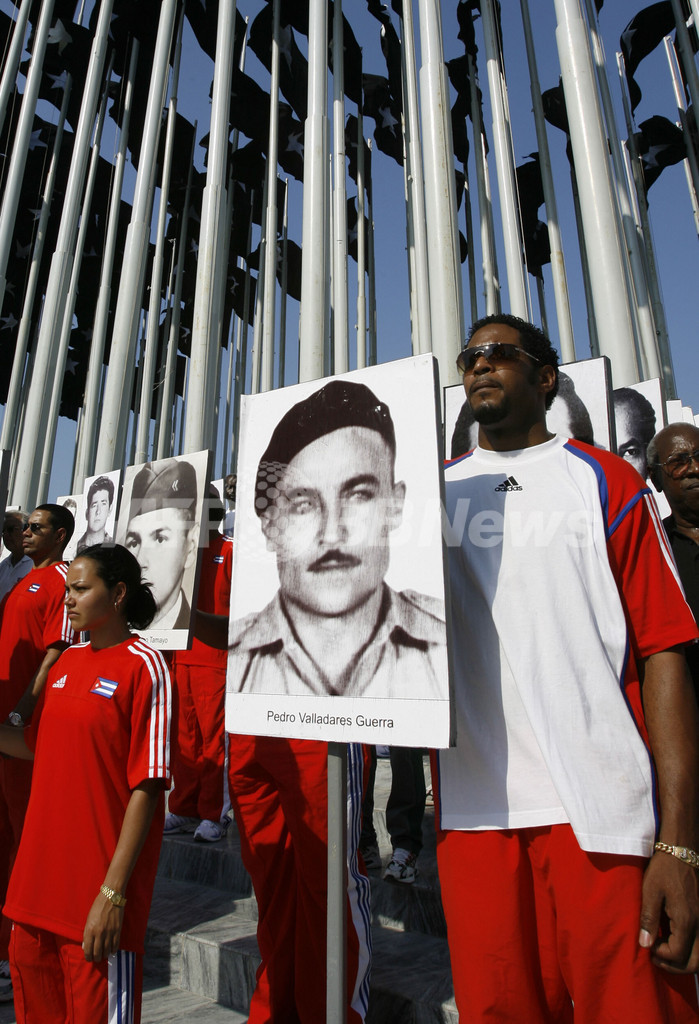 【ハバナ/キューバ 22日 AFP】1976年に起きたキューバ航空機爆破墜落事件の犠牲者家族は、この事件の容疑者で別件により米国政府に身柄を拘束されているルイス・ポサダ・カリレス(Luis Posada Carriles)容疑者が保釈されたことに抗議して、20日から夜通しの抗議活動を行う一方、21日には著名人や一般市民が加わり、首都ハバナ(Havana)でデモ活動を行った。カリレス容疑者は、米中央情報局(CIA)元工作員として広く反キューバ活動に関与したとされている。デモ活動では多くの黒い旗に囲まれるなか犠牲者73人の写真が掲げられた。デモ参加者はカリレス容疑者が、移民法に関連した軽微な犯罪ではなく、テロリストとして法定で裁かれるよう求めた。写真は21日、駐ハバナ米国利益代表部前で、犠牲者の写真を掲げて抗議するキューバ出身の元陸上選手・ハビエル・ソトマヨル(Javier Sotomayor)さん。(c)AFP/Rodrigo ARANGUA