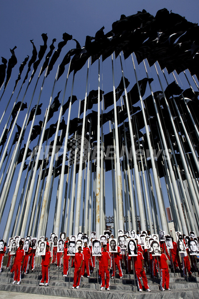 【ハバナ/キューバ 22日 AFP】1976年に起きたキューバ航空機爆破墜落事件の犠牲者家族は、この事件の容疑者で別件により米国政府に身柄を拘束されているルイス・ポサダ・カリレス(Luis Posada Carriles)容疑者が保釈されたことに抗議して、20日から夜通しの抗議活動を行う一方、21日には著名人や一般市民が加わり、首都ハバナ(Havana)でデモ活動を行った。カリレス容疑者は、米中央情報局(CIA)元工作員として広く反キューバ活動に関与したとされている。デモ活動では多くの黒い旗に囲まれるなか犠牲者73人の写真が掲げられた。デモ参加者はカリレス容疑者が、移民法に関連した軽微な犯罪ではなく、テロリストとして法定で裁かれるよう求めた。写真は21日、駐ハバナ米国利益代表部前で、犠牲者の写真を掲げて抗議するキューバ出身の元陸上選手・ハビエル・ソトマヨル(Javier Sotomayor)さん。(c)AFP/Rodrigo ARANGUA