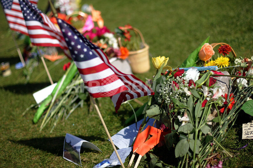 写真は21日、犠牲者に手向けられた花束と国旗。(c)AFP/TIM SLOAN
