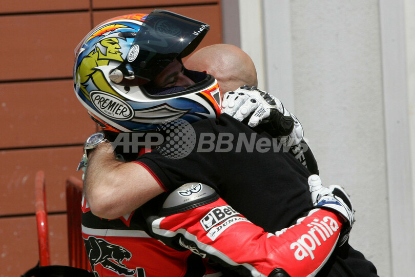 【イスタンブール/トルコ 22日 AFP】世界ロードレース選手権(WGP)・第3戦トルコGP・125ccクラス、決勝。3番グリッドからスタートしたスキルド・レーシング(Skilled Racing)のシモーネ・コルシ(Simone Corsi)は、40分3秒557をマークして今季初優勝を飾った。写真は、チームスタッフと優勝を分かち合うコルシ(左)。(c)AFP/MUSTAFA OZER