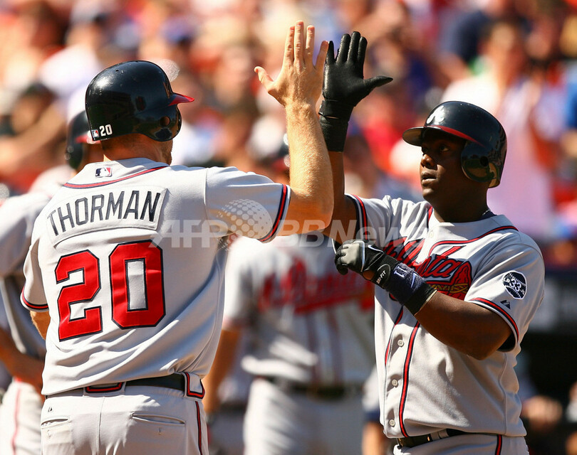【ニューヨーク/米国 22日 AFP】07MLB、ニューヨーク・メッツ(New York Mets)vsアトランタ・ブレーブス(Atlanta Braves)。1番・二塁で先発したブレーブスのケリー・ジョンソン(Kelly Johnson)は、1回に先頭打者本塁打、6-6の同点で迎えた8回には決勝の3点本塁打を放つなど4打数3安打4打点の活躍でチームを勝利に導いた。試合はブレーブスが9-6でメッツを破り、今季12勝目を挙げた。(c)AFP/Getty Images Al Bello