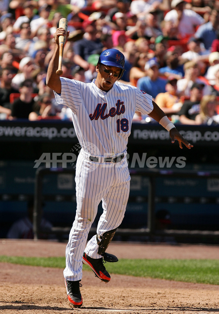 【ニューヨーク/米国 22日 AFP】07MLB、ニューヨーク・メッツ(New York Mets)vsアトランタ・ブレーブス(Atlanta Braves)。1番・二塁で先発したブレーブスのケリー・ジョンソン(Kelly Johnson)は、1回に先頭打者本塁打、6-6の同点で迎えた8回には決勝の3点本塁打を放つなど4打数3安打4打点の活躍でチームを勝利に導いた。試合はブレーブスが9-6でメッツを破り、今季12勝目を挙げた。(c)AFP/Getty Images Al Bello