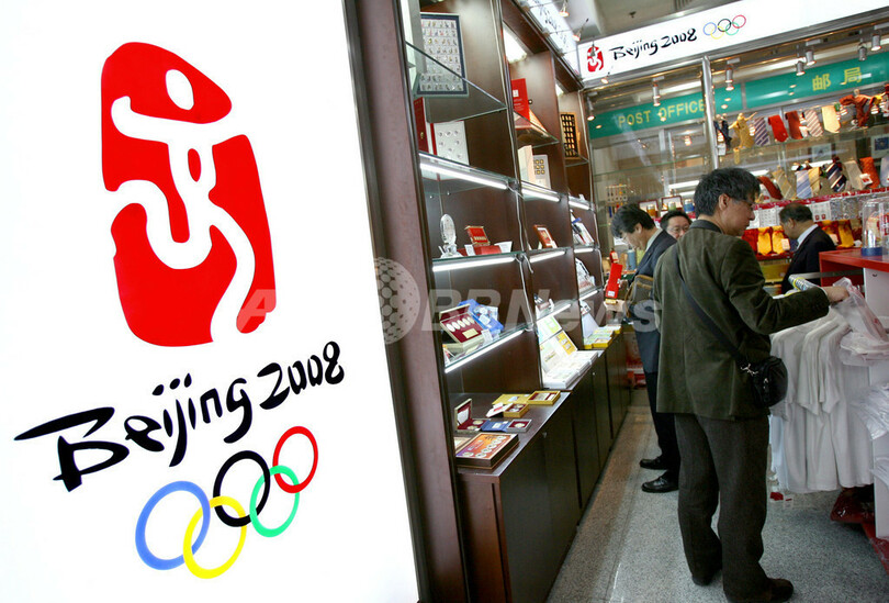 写真は同日、北京市内に設置されている北京五輪のロゴ。(c)AFP/TEH ENG KOON