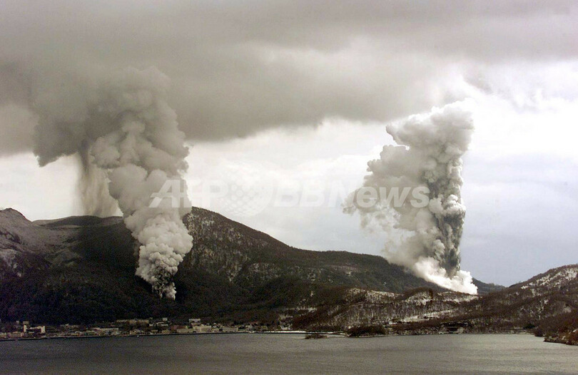 写真は2008年のG8サミット会場に選ばれた北海道・洞爺湖畔の洞爺湖町から臨んだ対岸の有珠山(2000年4月1日撮影)。(c)AFP/Kazuhiro NOGI