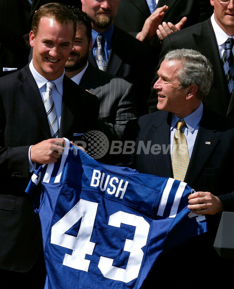 【ワシントンD.C./米国 23日 AFP】NFL、シカゴ・ベアーズ(Chicago Bears)との第41回スーパーボウル(Super Bowl XLI)を29-17で勝利し、36年振りに2度目となるスーパーボウル制覇を果たしたインディアナポリス・コルツ(Indianapolis Colts)のヘッドコーチを務めるトニー・ダンジー(Tony Dungy)やQBのペイトン・マニング(Peyton Manning)を始めコルツの選手たちは、ホワイトハウス(White House)を訪れ、ジョージ・W・ブッシュ(George W. Bush)大統領と面会した。写真は、ホワイトハウスの南芝地でブッシュ大統領にジャージをプレゼントするペイトン・マニング(左)。(c)AFP/Getty Images Mark Wilson