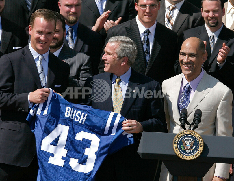 【ワシントンD.C./米国 23日 AFP】NFL、シカゴ・ベアーズ(Chicago Bears)との第41回スーパーボウル(Super Bowl XLI)を29-17で勝利し、36年振りに2度目となるスーパーボウル制覇を果たしたインディアナポリス・コルツ(Indianapolis Colts)のヘッドコーチを務めるトニー・ダンジー(Tony Dungy)やQBのペイトン・マニング(Peyton Manning)を始めコルツの選手たちは、ホワイトハウス(White House)を訪れ、ジョージ・W・ブッシュ(George W. Bush)大統領と面会した。写真は、ホワイトハウスの南芝地でブッシュ大統領にジャージをプレゼントするペイトン・マニング(左)。(c)AFP/Getty Images Mark Wilson