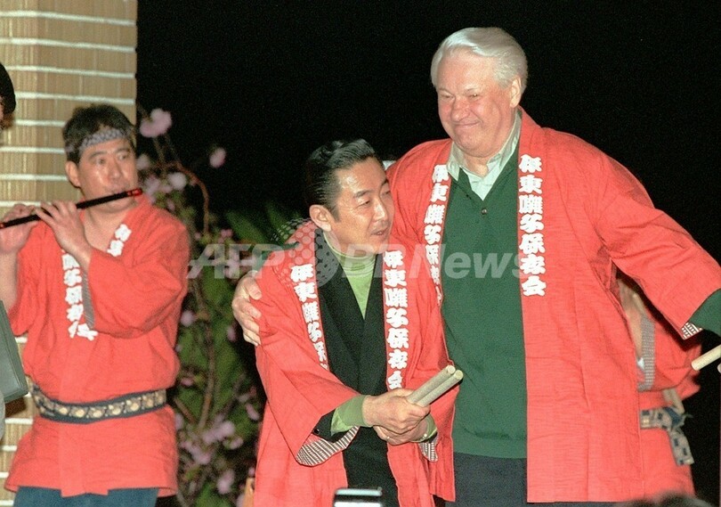 写真は静岡県伊東市で1998年4月に行われた非公式の日露首脳会談(川奈サミット)後、歓迎イベントに出席したエリツィン前大統領(右)と橋本龍太郎元首相。(1998年4月18日撮影)(c)AFP/KAZUHIRO NOGI