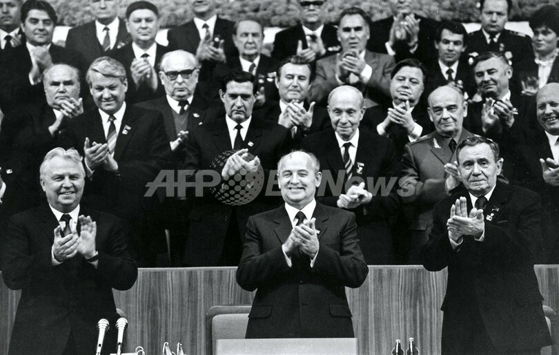写真はモスクワで、ゴルバチョフ大統領(前列中央)時代の旧ソビエト連邦共産党大会。故エリツィン前大統領(2列目左)のほか、アンドレイ・グロムイコ(Andrei Gromyko)外相(前列右)やエゴール・リガチョフ(Igor Ligachyov )第二書記(前列左)らの顔も見える(1986年2月25日撮影)。(c)AFP