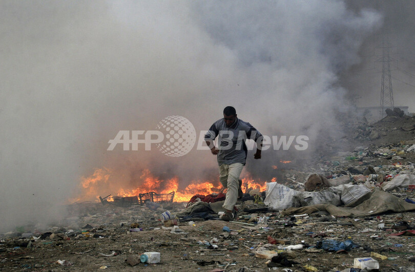 写真は同日、バグダッド郊外の貧困地域サドルシティー(Sadr City)で発生した別の爆発テロ現場で、炎の中を走る男性。(c)AFP/WISSAM AL-OKAILI