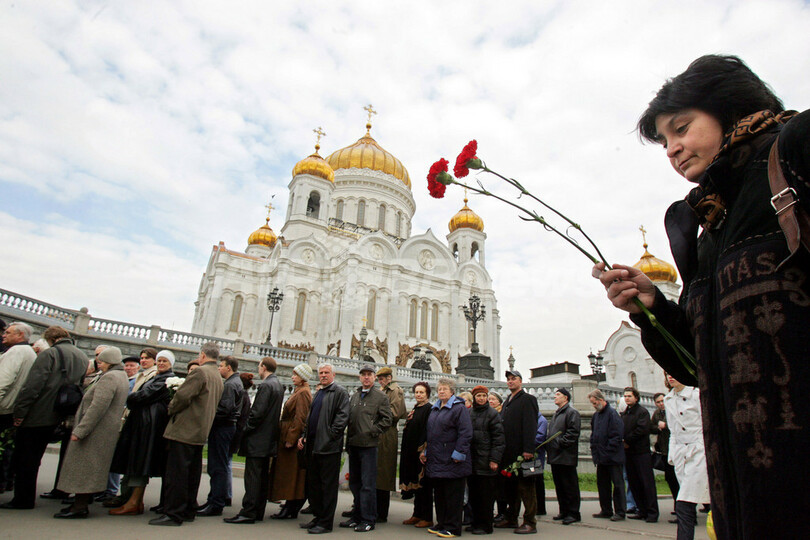 ロウソクと国旗で囲まれたエリツィン前大統領のひつぎは、モスクワの救世主キリスト大寺院に安置され、寺院の外には500メートルにも及ぶ列が作られた。