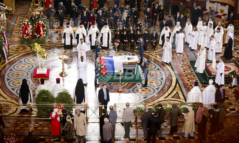 ロウソクと国旗で囲まれたエリツィン前大統領のひつぎは、モスクワの救世主キリスト大寺院に安置され、寺院の外には500メートルにも及ぶ列が作られた。