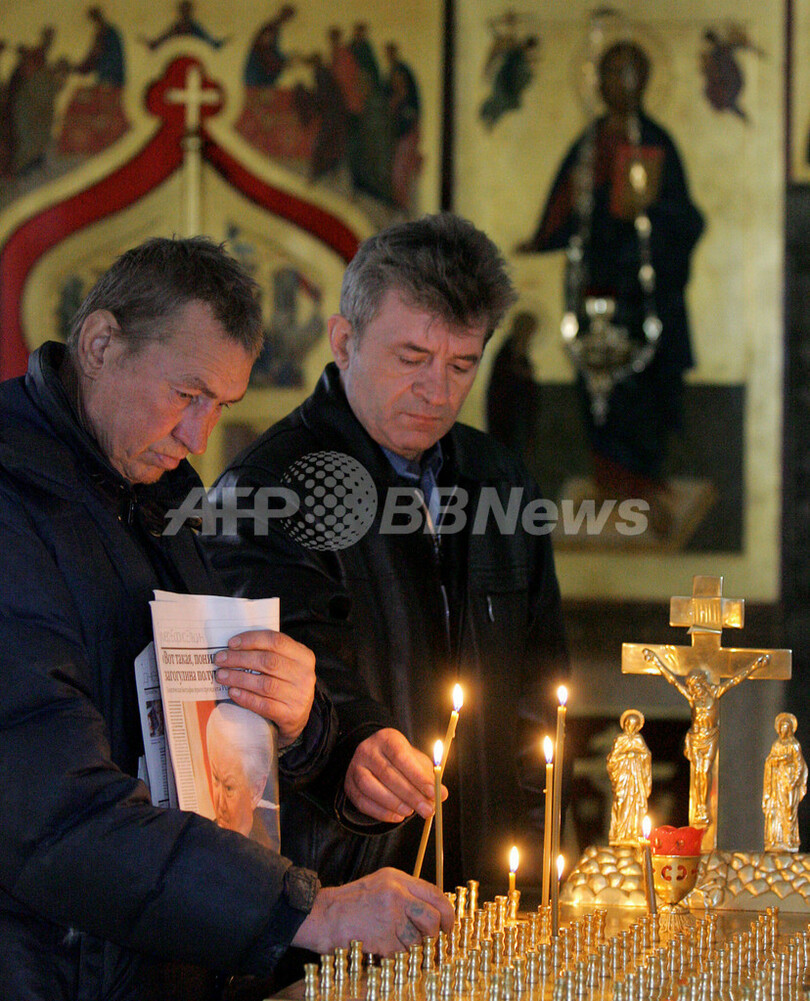 写真は24日、モスクワの救世主キリスト大寺院で執り行われたエリツィン前大統領を悼む式典。(c)AFP