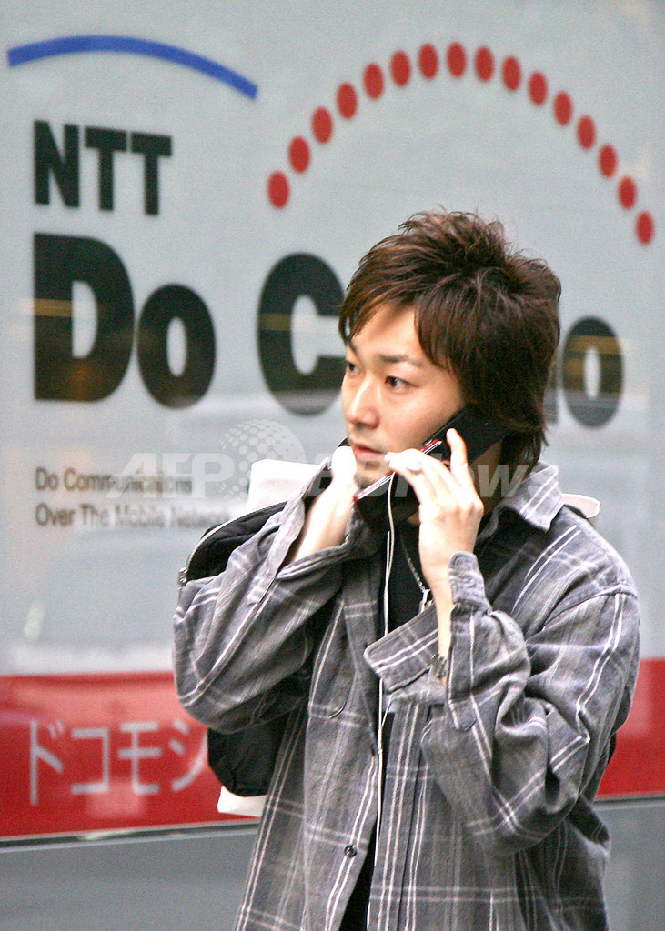写真は都内で、NTTドコモの店舗前を携帯を手に通り過ぎる男性(2006年10月27日撮影)。(c)AFP/YOSHIKAZU TSUNO