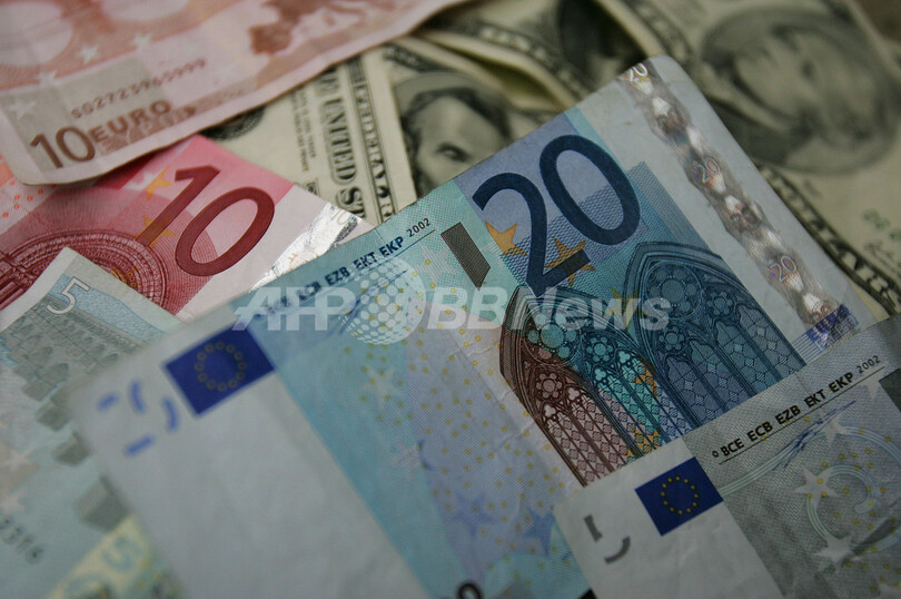 写真は積まれたドル紙幣とユーロ紙幣(2004年11月19日撮影)。(c)AFP/Getty Images/Chris Hondros
